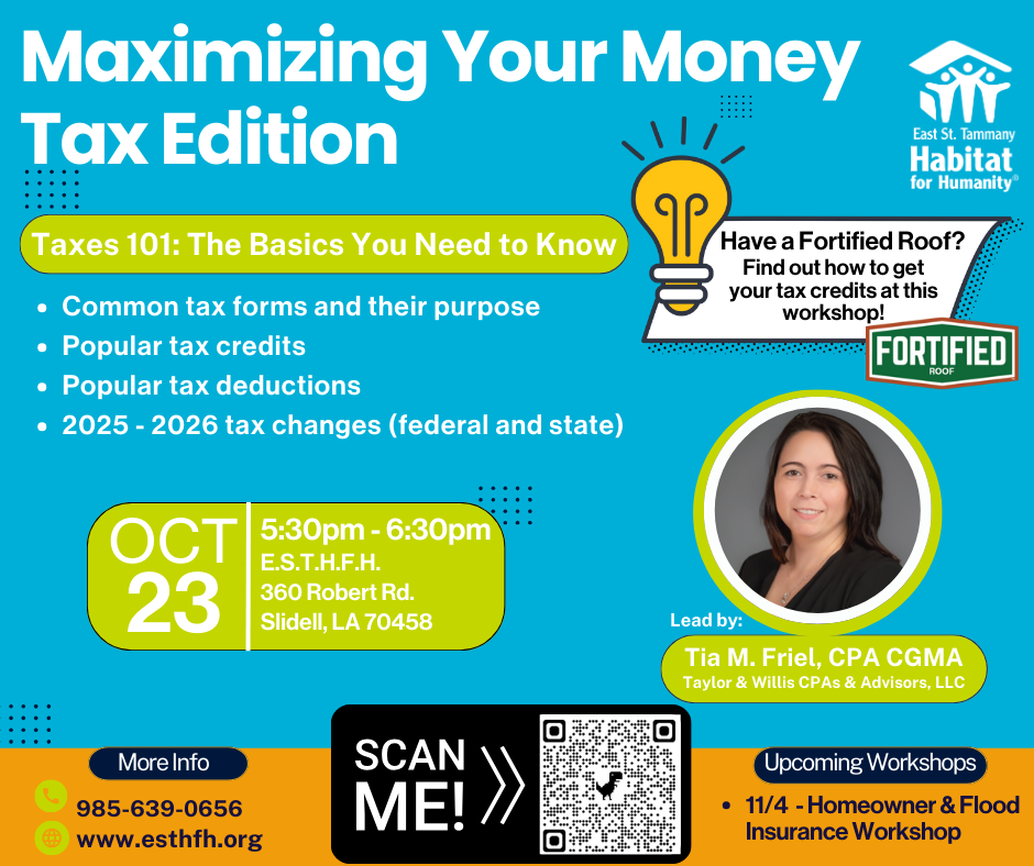 Maximizing Your Money: Tax EditionJoin East St. Tammany Habitat for Humanity for a free financial workshop focused on helping you better understand your taxes. CPA Tia M. Friel will cover […]