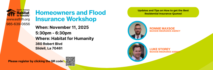 Join East St. Tammany Habitat for Humanity for an informative Homeowners and Flood Insurance Workshop presented by Ronnie Maxsoe and Luke Storey of Maxsoe Insurance Agency.