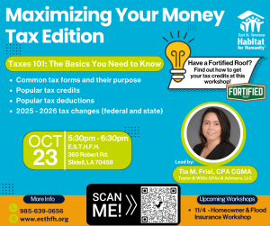 Join East St. Tammany Habitat for Humanity for a free financial workshop focused on helping you better understand your taxes. CPA Tia M. Friel will cover the basics, including common tax forms, popular tax credits and deductions, and upcoming 2025–2026 federal and state tax changes.