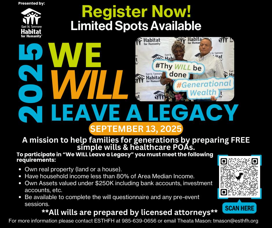 That’s why East St. Tammany Habitat for Humanity is hosting We WILL Leave a Legacy, a free event where you can meet with an attorney and create your simple will and healthcare Power of Attorney (POA) at no cost.